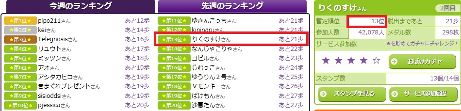 気になる順位は暫定13位。まだゴールした人はいない模様です。