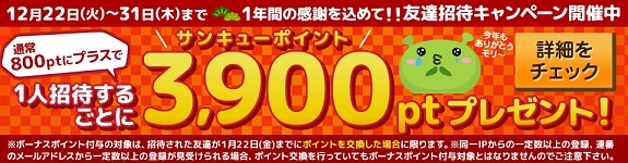 プラス3,900pt(390円)と大幅アップですので、この機会にお友達紹介もしましょう。