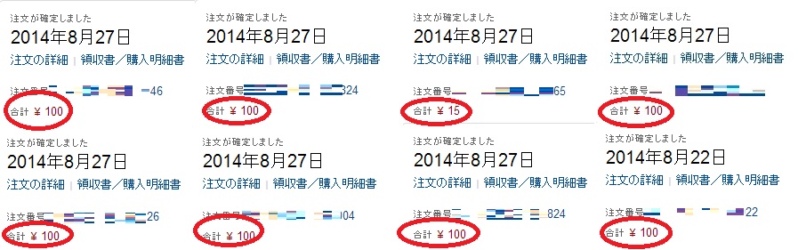 15円のギフト券を1回購入したんですが、そのほかの7回は100円で購入しました。