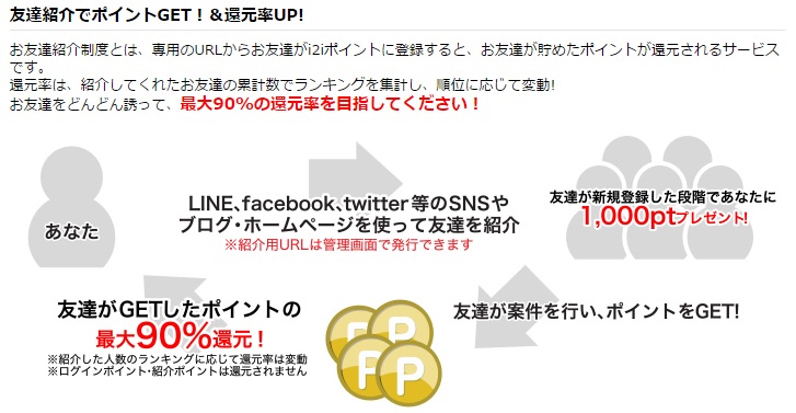 紹介した友達が『i2iポイント』に登録したら1,000pt(100円)プレゼントされ
