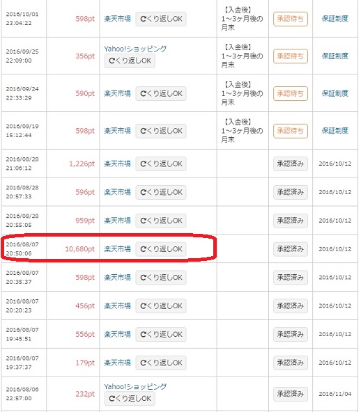 下の画像は私がポイントタウンを経由して、楽天市場やYahoo!ショッピングを利用した