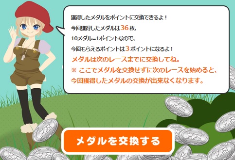 注)レースが終了したその度にメダルをポイントに交換してください。