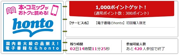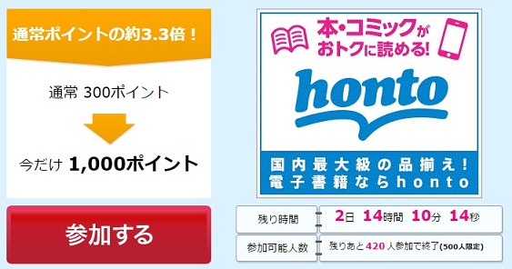 ハピタス 【電子書籍のhonto】初回購入限定で1,000円分のポイントがもらえます。