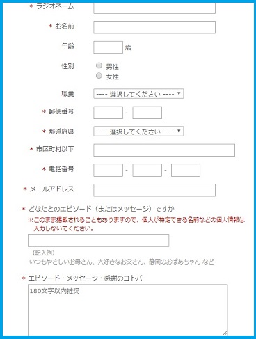 次に、あなたのラジオネームや氏名・年齢・住所と共にエピソード・メッセージ・感謝のコトバを入力します。