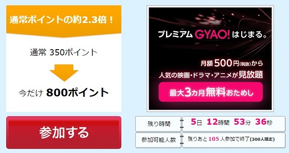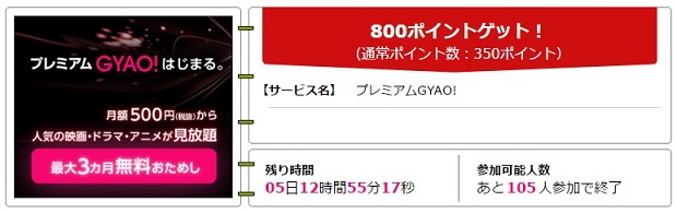 「プレミアムGYAO!」登録で800pt(800円)です。