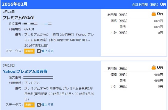 私の場合は、プレミアムGYAO!は5月31日まで、Yahoo!プレミアムは4月30日まで