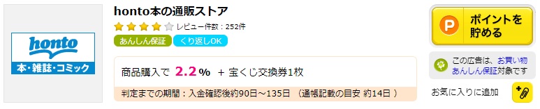 432円からhontoポイント60pt分の60円が値引きされます。また、ハピタスを経由しているので8円分ハピタスポイントが還元されるので、最終的には364円相当で購入できる事になります。