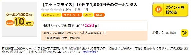 10円で1,000円分のクーポン購入で 550pt(550円)貰える!!!!!!!!!