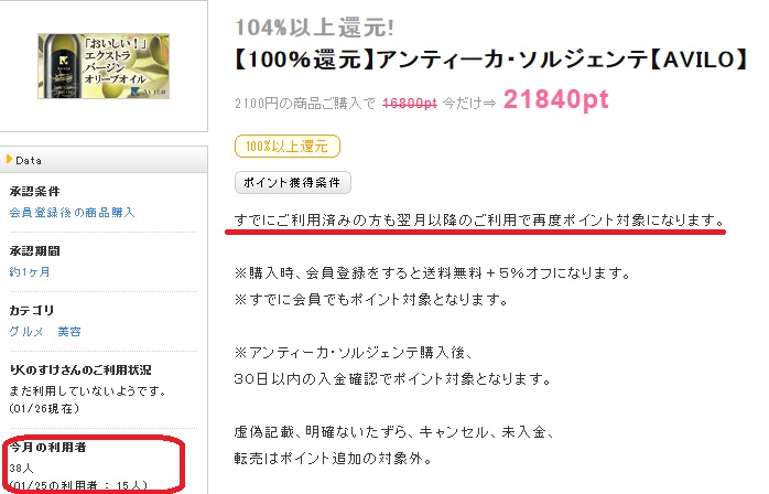 『ハピタス』みんなdeポイント オリーブオイルが117%還元』