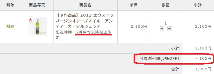 私は前回購入のオリーブオイルがまだ残っているので2月中旬以降に届くように