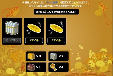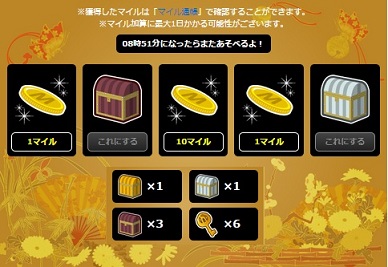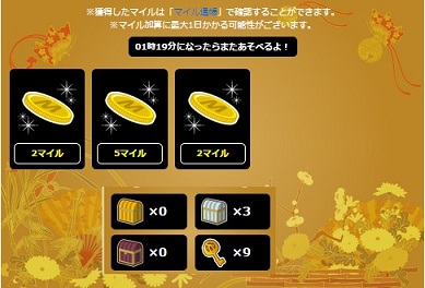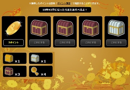 金の宝箱からは10pt=5円の出現が多いですね。それ以上は出ない・・・。
