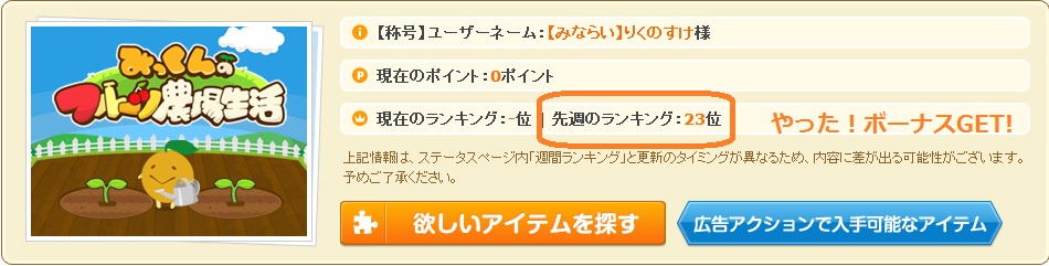 今週、ゲーム参加で手に入れたアイテムを駆使して上位入賞を目指した「フルーツ農場」