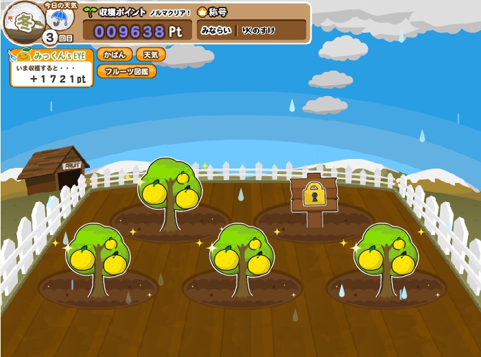 簡単に説明すると、畑にフルーツの種をまいて、水を上げて、収穫するといったゲーム。