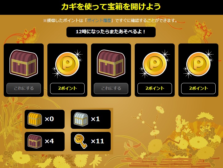ゴールド・シルバー・ノーマル全ての宝箱をGETし、カギも12個と高ポイントの予感が