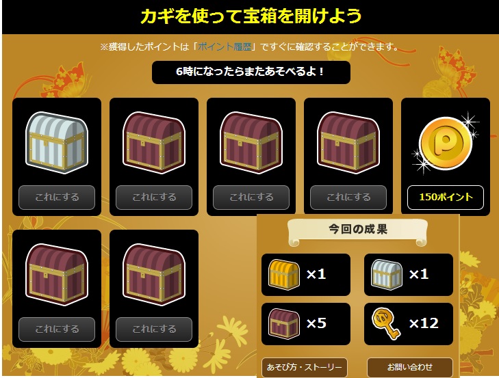 していたのですが、開いた宝箱はゴールドのみ150pt出てくれたのでよかったけど・・・。