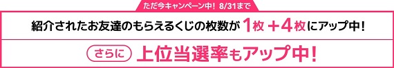 さらに8月31日までキャンペーンにつき通常1枚しか貰えない「友達紹介くじ」ですが、紹介されたお友達に限り+4枚の計5枚が付与されるので上位当選確率もアップ中です。
