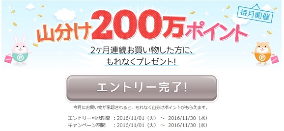 2ヶ月連続でお買い物をすると200万ポイント(10万円)の山分けに参加できます。