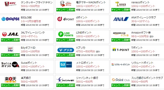利用しやすいのは、nanacoポイント(100G~)、amazonギフト券(98G~)だと