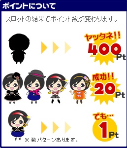絵柄が揃うと20pt(2円)・シークレット絵柄だと400pt(40円)・ハズレでも1pt(0.1円)