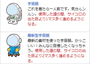 ★宇宙服・・・・・・使用した週の間、サイコロの出目より1マス多く進める。