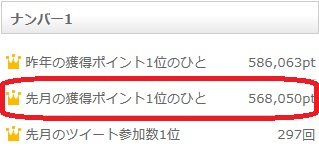 ちなみの、先月のNo1だった人の獲得ポイントは568,050pt(約56万円)も稼いでいます。