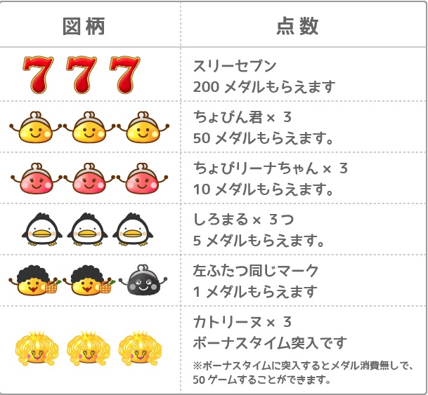 初めの手持ちコインは50枚、メダルが50枚以下の時は5分に1枚追加され50枚がマックス。