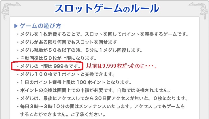 メダルの上限は999枚です。って書かれてた・・・。以前は9,999枚だったのに。