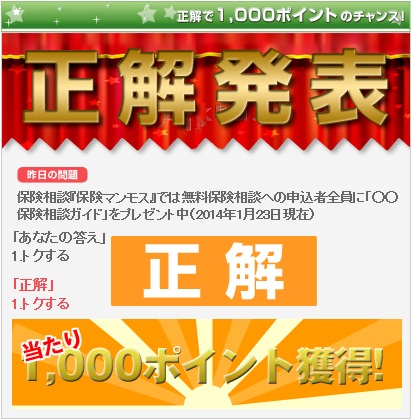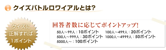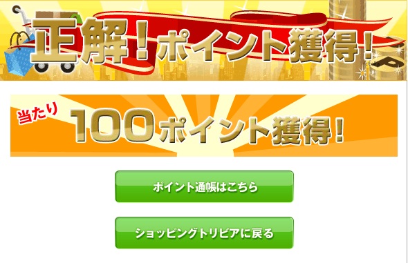 簡単に言うと、商品に関係するクイズが出題され正解すると1pt+100ptの