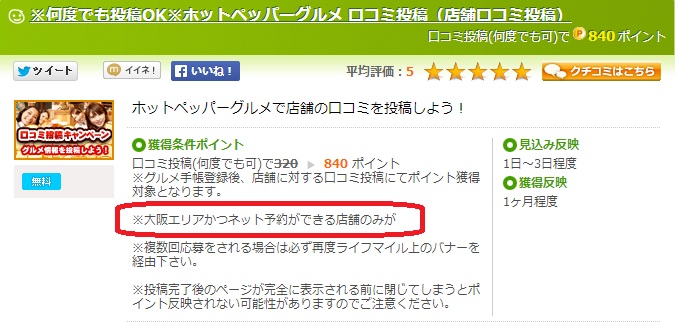 他のポイントサイトが大阪以外ダメって言っている以上気になる方は、大阪のネット予約