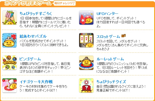『ちょびリッチ』数多くのゲームが存在します。全部で8種類。