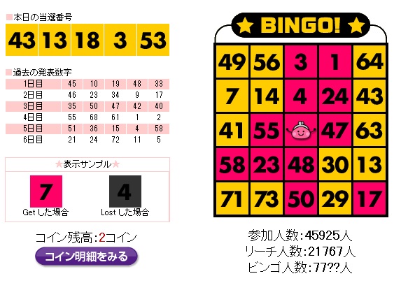 毎日発表される番号を確認しながらビンゴシートをクリックしてビンゴを目指します。