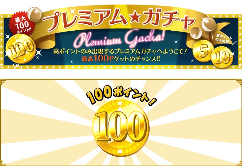 6日に1度訪れるプレミアムガチャは最低5pt、最高100ptとガッツリ稼ぐことが出来ます。