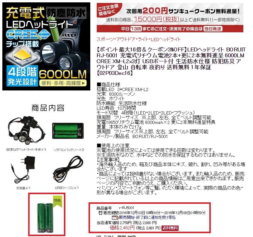 レビュー等を読んでみると、6000ルーメンは大げさのようですが、それでも18650リチウム電池が計4本と本体のヘッドランプの事を考えると十分お得と判断して購入しました。